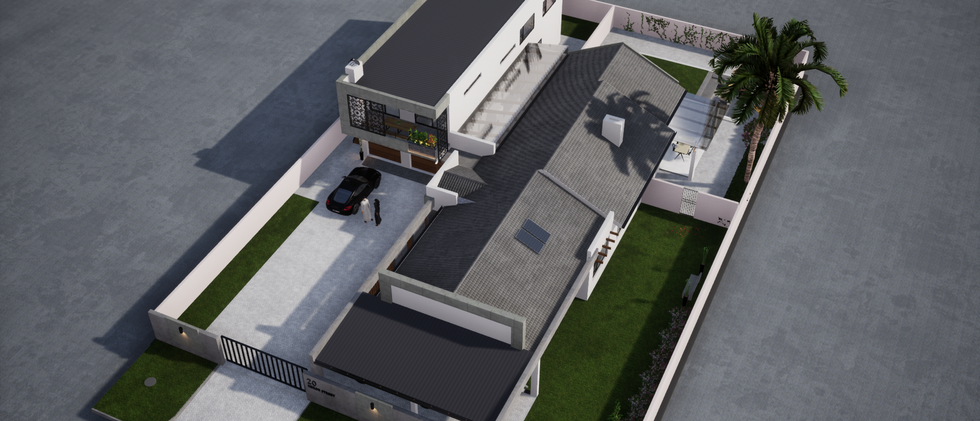This house features off-shutter concrete finish and raw materials creating a acclimatized and contemporary design. Achieved by opening up the plan in the living spaces that extend onto an expansive covered terrace with a fire pit. The exposed facades are clad in an arabesque cut out screens to reduce the solar heat gain and allow for privacy.