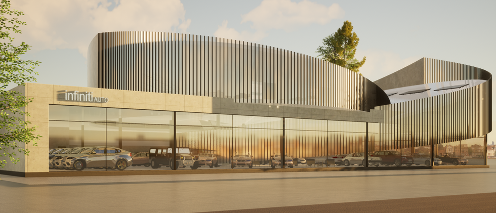 A futuristic design of a showroom and office space for an exclusive vehicle business